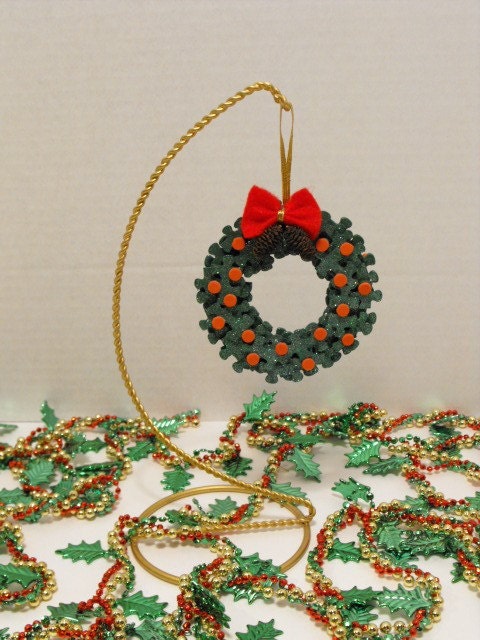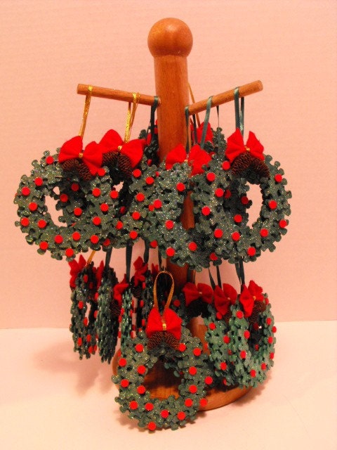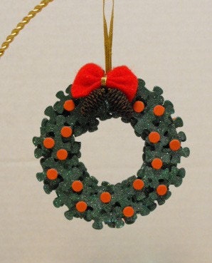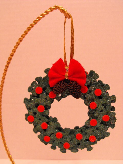 These unique little wreaths are made with real puzzle pieces. It is painted and finished on both sides of ornaments. They are lightly finished with sparkle dust. Real mini pine cones and a bow in the center at the top and a gold colored string to hang the wreath on your tree or stand.