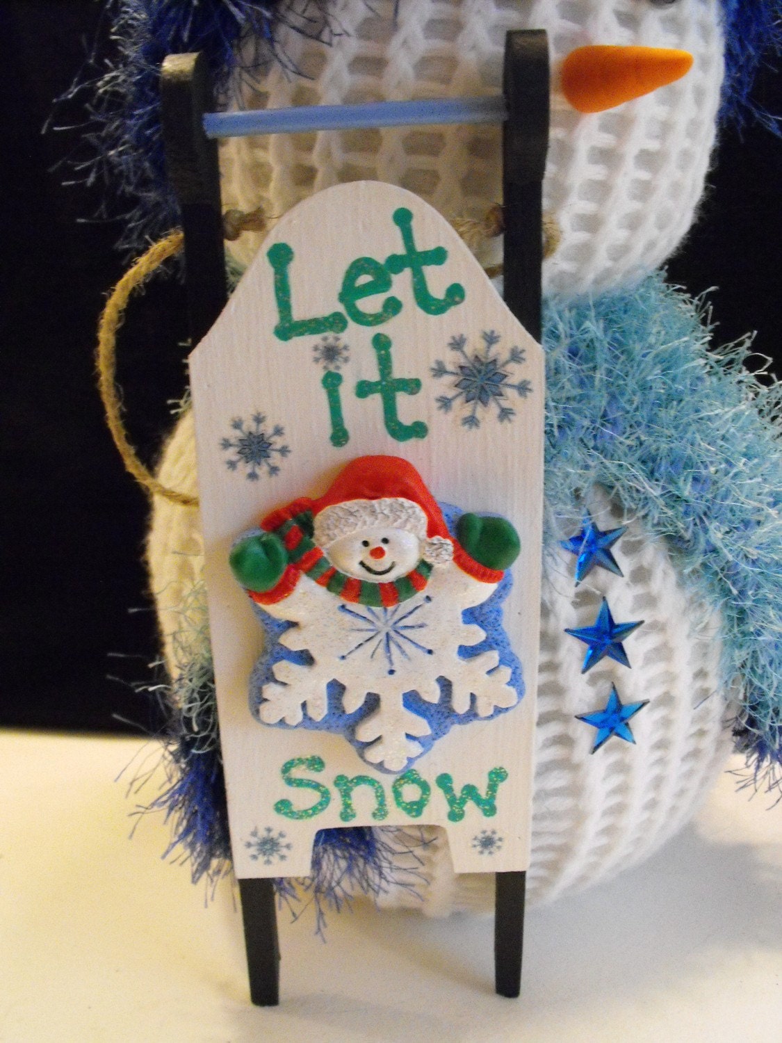 It has a light blue, hand knitted, hat and scarf with dark blue trim. The snowman has large googly eyes and a handmade clay carrot nose. Down the front of the snowman’s middle are 3 blue star shaped rhinestone buttons. The snowman is holding a hand painted wooden sled. Attached to the sled is a ceramic snowflake all dressed up in his winter attire. Written on the sled is the phrase “Let it Snow”.