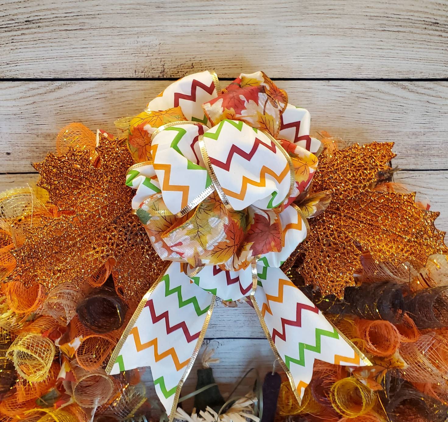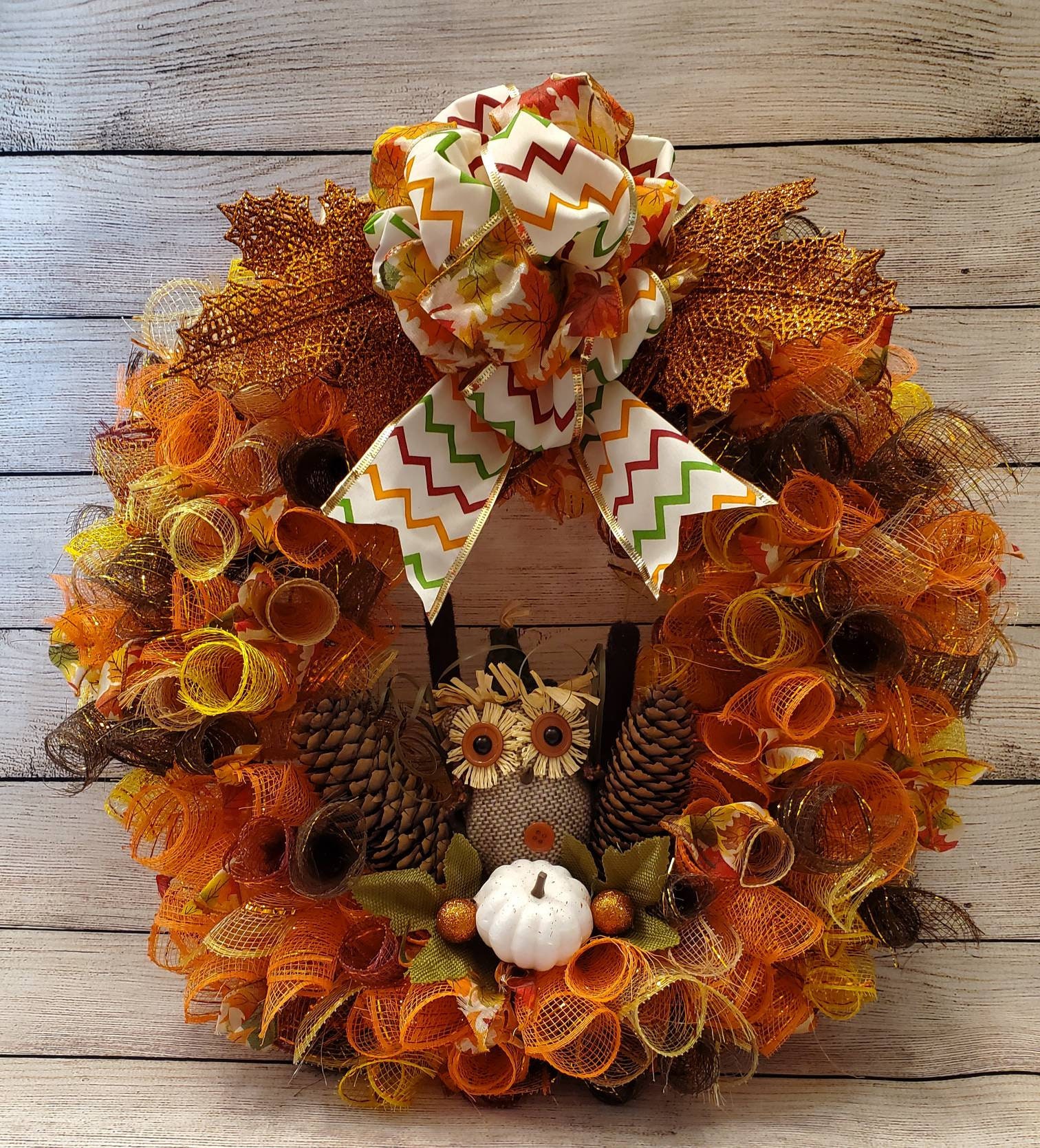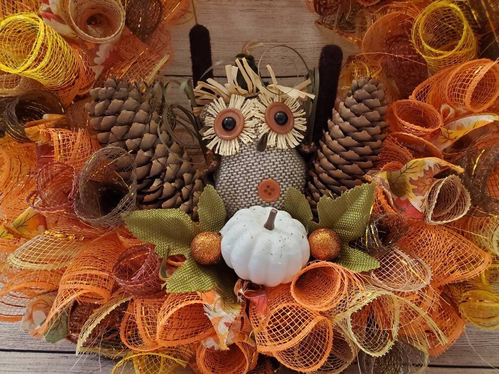 This 18 inch wreath is perfect for the whole Fall season. 4 different colors of mesh rolled and attached to the frame mixed with a sheer wire edge ribbon with multi colored leaves on it. The large bow at the top is made with 2 different wire edge ribbons One is the same sheer leaf print ribbon used with the mesh and the other is white with gold trim and green, orange and a dark red striped zigzag pattern. Next to the bow are 2 six inch orange glitted leaves that look almost like a lace design. At the bottom center of the wreath sits a rustic little owl sitting between two tall pinecones and two cattails. In front of theowl is two green burlap leaves a white pumpkin and a couple orange glittered balls.