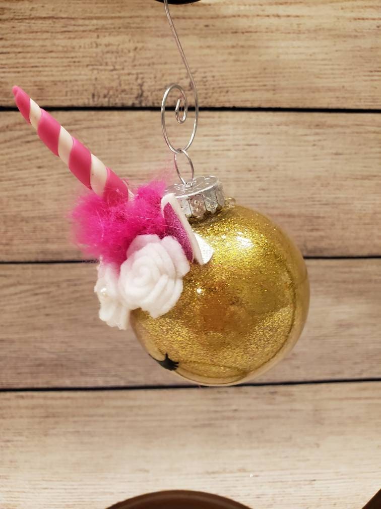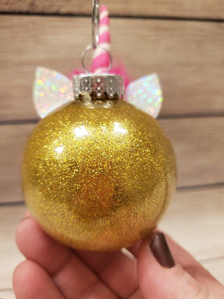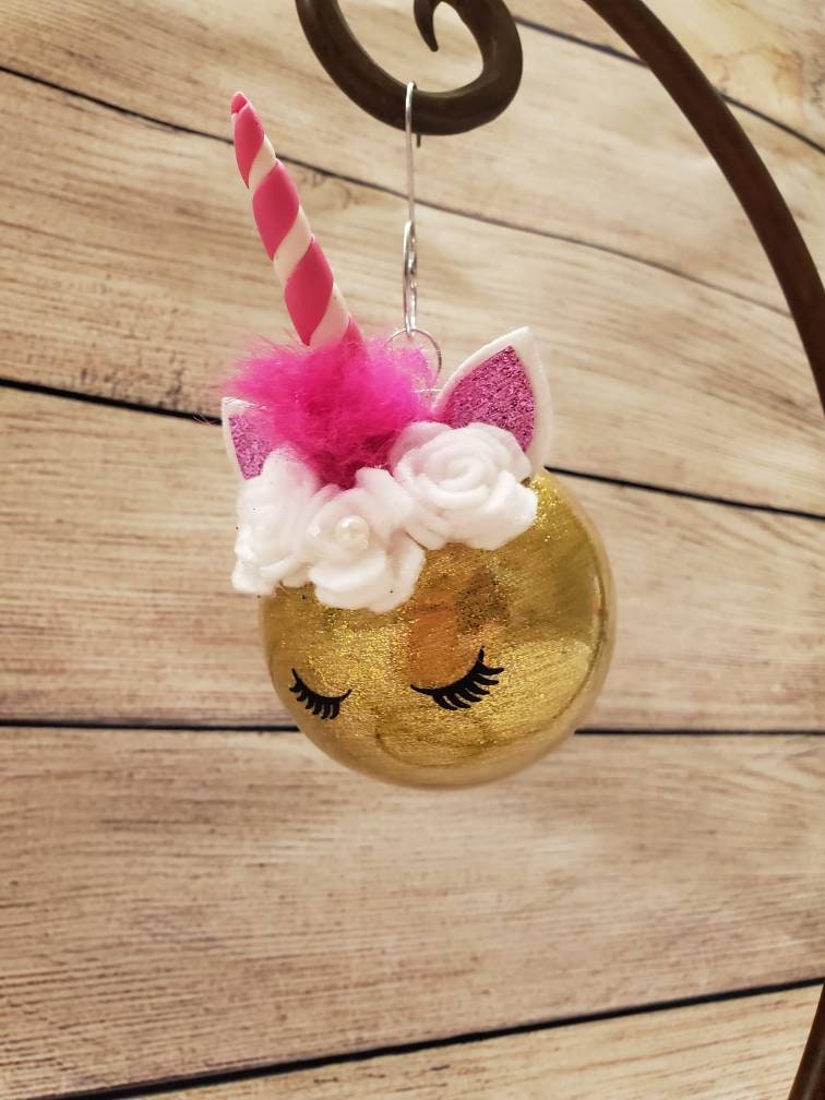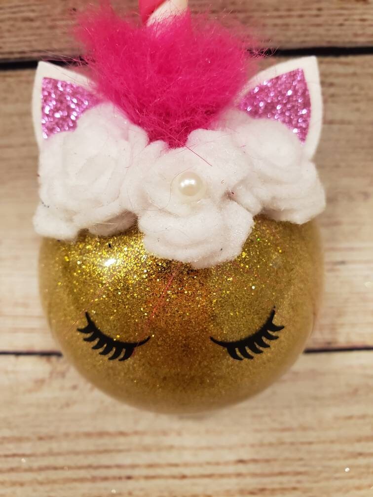 Shatterproof gold glittery unicorn ornament. This ornament has a gold glitter on the inside so less mess for you but all the sparkle. The horn is handmade from pink and white polymer clay around the horn is the pink fur mane. Below the horn is 3 mini handmade felt flowers with a pearl in the center of the middle one. And black permanent vinyl eyelashes. This ornament is approximately 3 inches wide 4 inches tall and 3 inches thick. If you would like your ornament personalized with name for just a $1 more. Please leave name you would like on ornament in message area when you purchase it.