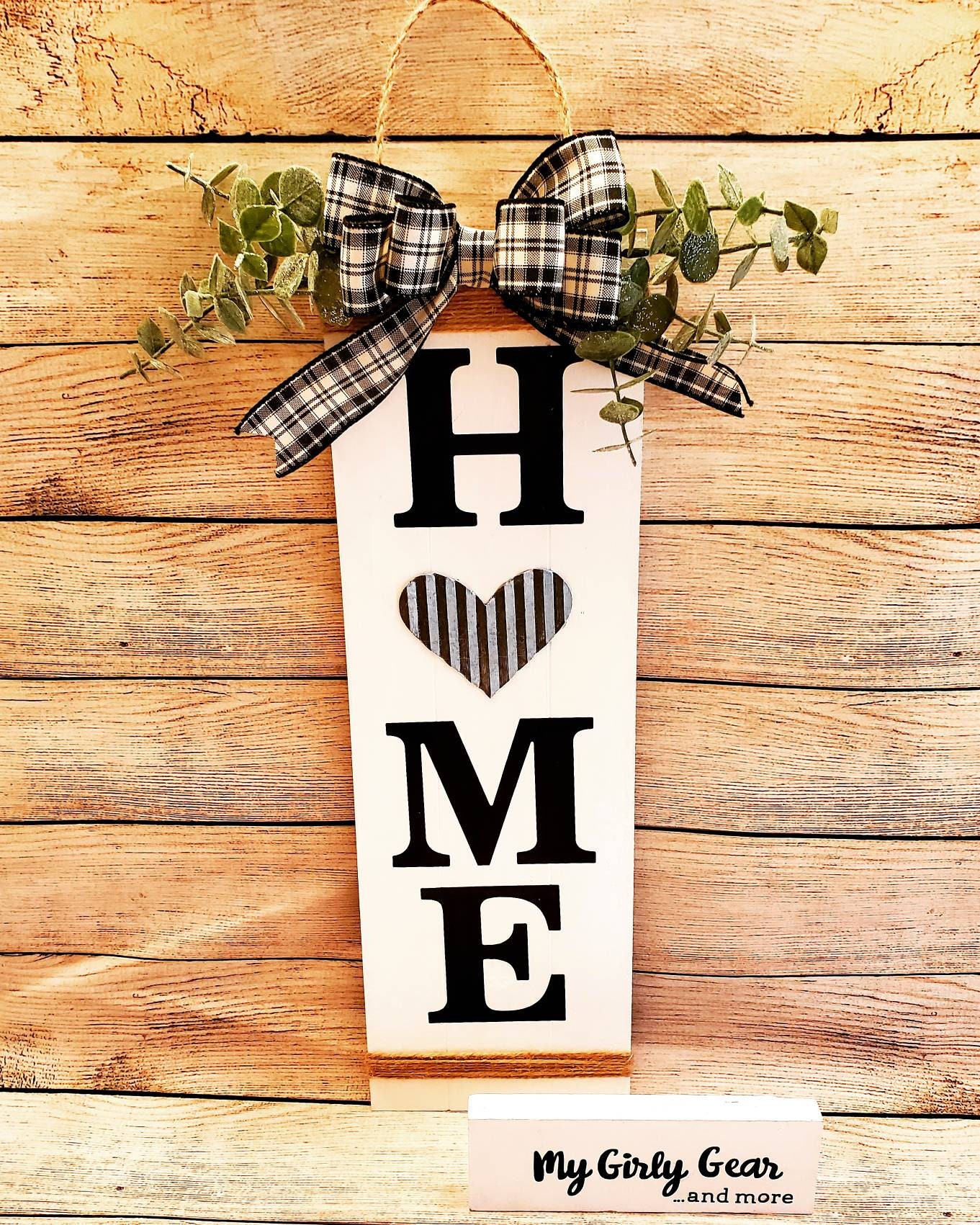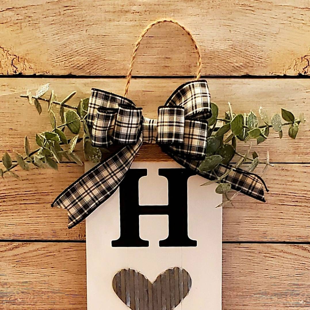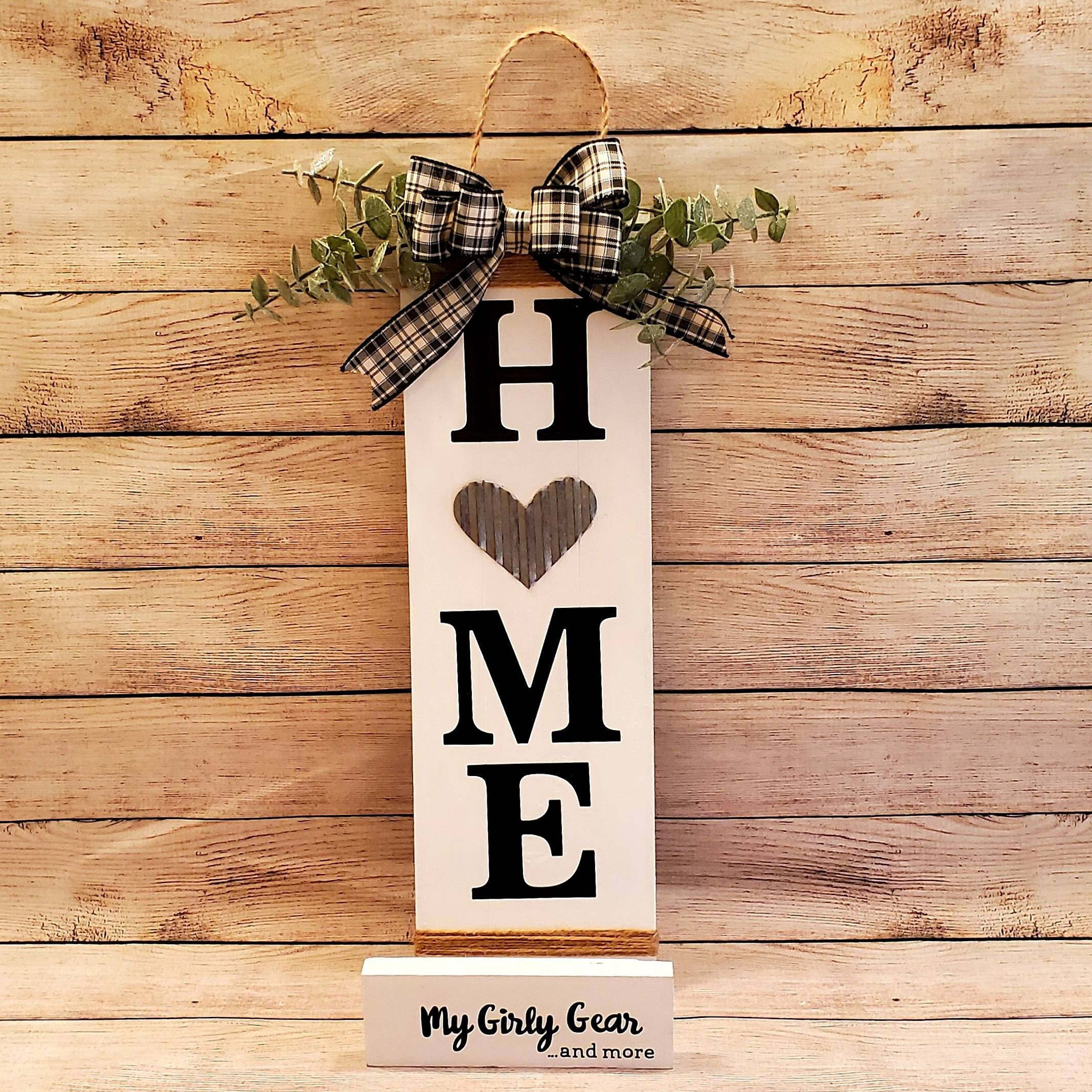 Lightweight farmhouse style Home sign. With black and white plaid bow and lightly sparkling eucalyptus bunchs at the top painted a matte white and matte sealer. HOME is written ina black matte adhesive vinyl except the O is a corrugated metal heart. This sign has a panel look but is made with a lightweight pressboard wood so is about 1/4 of an inch thick except at the top where th bow and greenery is approximately 2 inches thick. The base of the sign is 19 inches tall and 6 inches wide with an additional 3 to 4 inches wide including greenery at the top.This home sign fits most decor styles and can hang almost anywhere indoors. There is a braided twine string to hang is from at the top. It is also wrapped in twine many around the top and bottom of the whole sign.