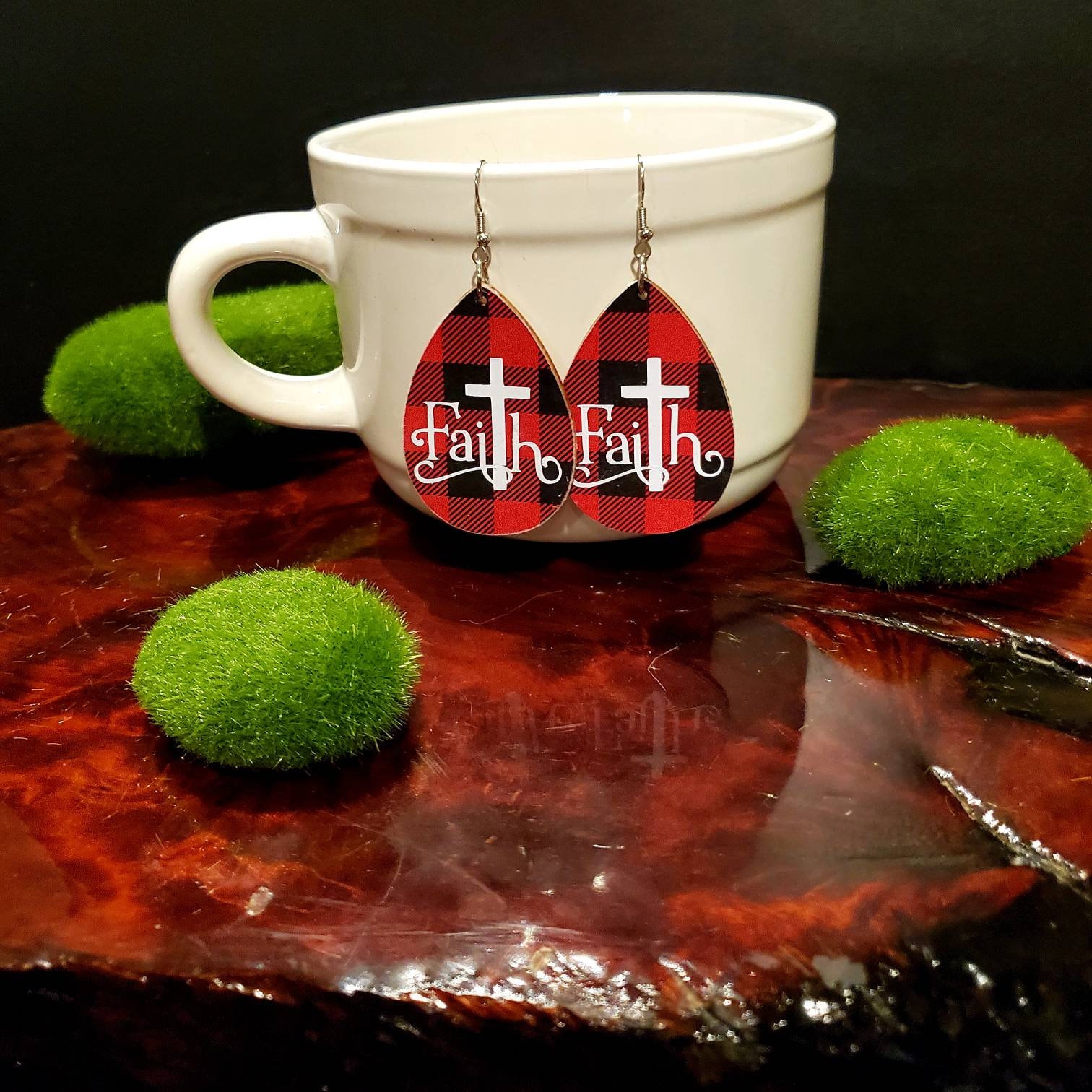 Wood slice teardrop shaped red and black buffalo check earrings with the word Faith on them with a cross for the T. The earrings are decoupaged with a a high quality buffalo check cardstock and sealed with a matte sealer. Finished with a matte white vinyl Faith design.