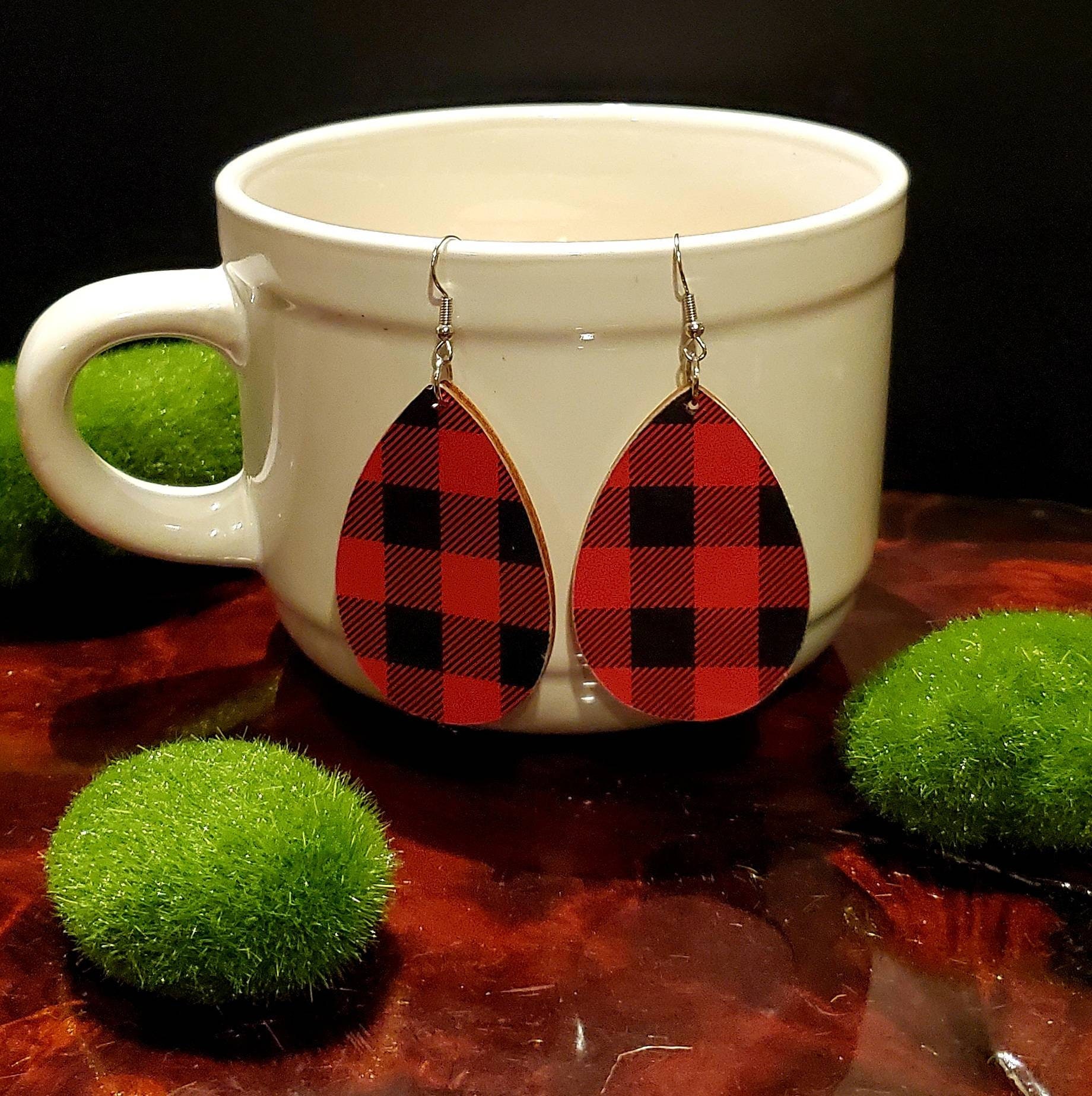 These lightweight teardrop shaped wood slice earrings are decoupaged with a high quality red and black buffalo check cardstock then sealed with a matte sealer. They are approximately 2 inches long 1 inch wide and 1/8 of an inch thick.